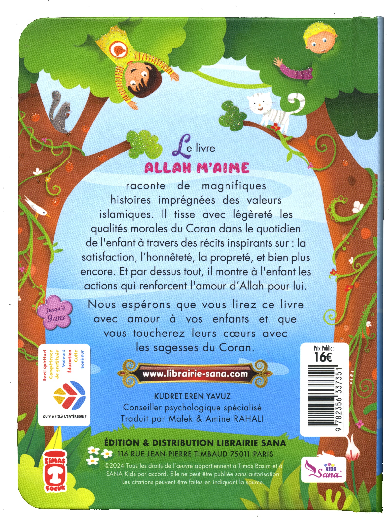 Le livre ALLAH M'AIME raconte de magnifiques histoires imprégnées des valeurs islamiques. Il tisse avec légèreté les qualités morales du Coran dans le quotidien de l'enfant à travers des récits inspirants sur : la satisfaction, l'honnêteté, la propreté, et bien plus encore. Et par-dessus tout, il montre à l'enfant les actions qui renforcent l'amour d'Allah pour lui. Nous espérons que vous lirez ce livre avec bonheur et amour à vos enfants et que vous toucherez leurs cœurs avec les sagesses du Coran.