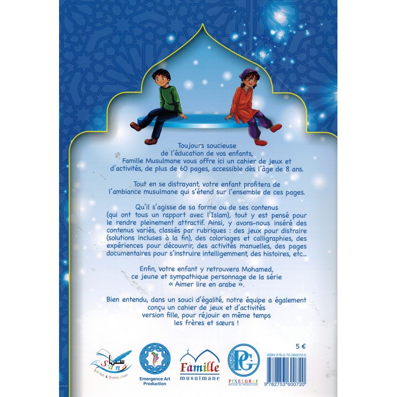 Toujours soucieuse de l’éducation de vos enfants, Famille Musulmane vous offre ici un cahier de jeux et d’activités, de plus de 60 pages, accessible dès l’âge de 8 ans. Tout en se distrayant, votre enfant profitera de l’ambiance musulmane qui s’étend sur l’ensemble de ses pages.