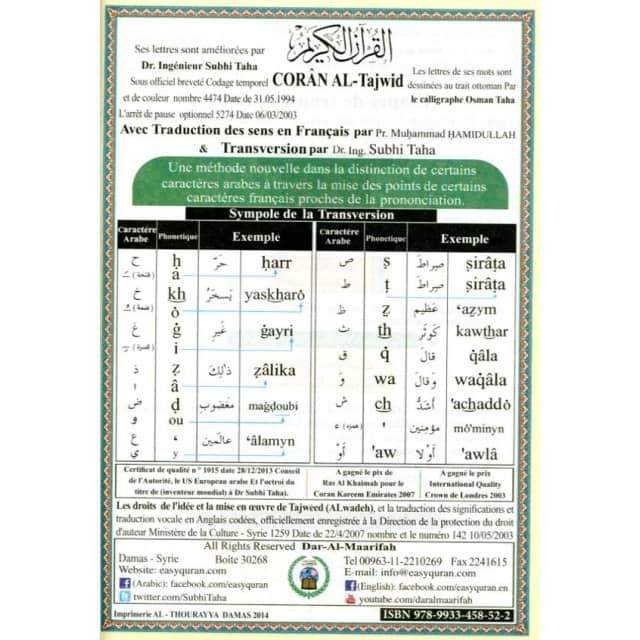 Une traduction des sens par le Professeur Muhammad HAMIDULLAH et une vocalisation phonétique en langue française de Dr ingenieur Subhi Taha.Un Coran proposé par l'édition Dar al Maarifah et distribué par Sana.