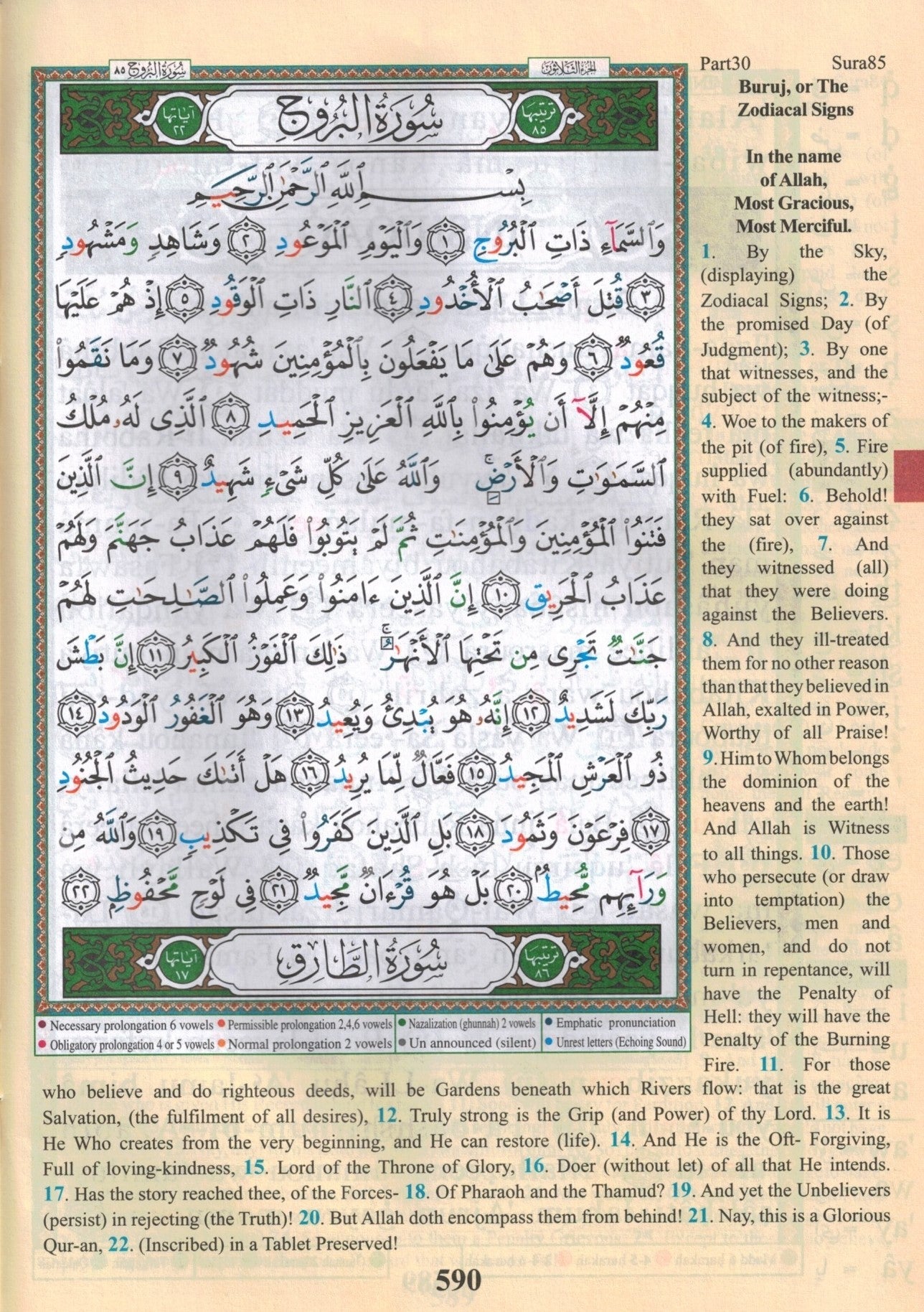 Application des règles de récitation pour faciliter la psalmodie du Coran : On donne à la lettre une couleur pour indiquer la règle de récitation à appliquer (Trois couleurs principales en plusieurs nuances : Rouge- Vert, Bleu, par contre le gris: indique les lettres écrites et non prononcée)