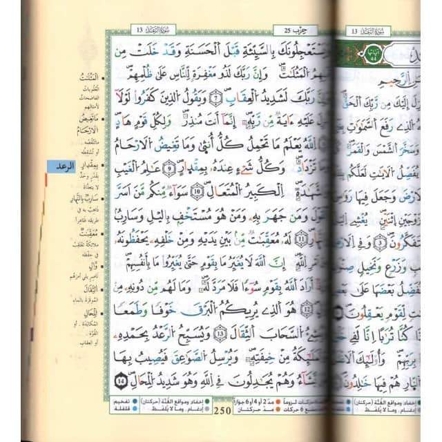 مصحف التجويد باستخدام اللون المرمز زمنيا في تدوين الأحرف الخاضعة لأحكام التجويد، مع شرح هذه الاحكام في أخر المصحف