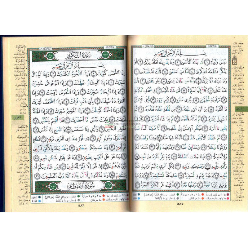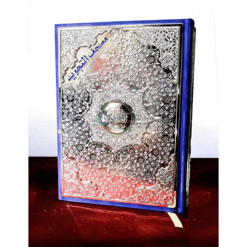 Coran Tajwid (hafs) en arabe avec couverture argentée sur fond bleu, une lecture en arabe simplifiée avec la focalisation facilitant ainsi la lecture sans maîtrise de la conjugaison, la lecture est axée sur le mouvement de la lecture, quand au tajwid il est facilité également sans en connaître les règles.