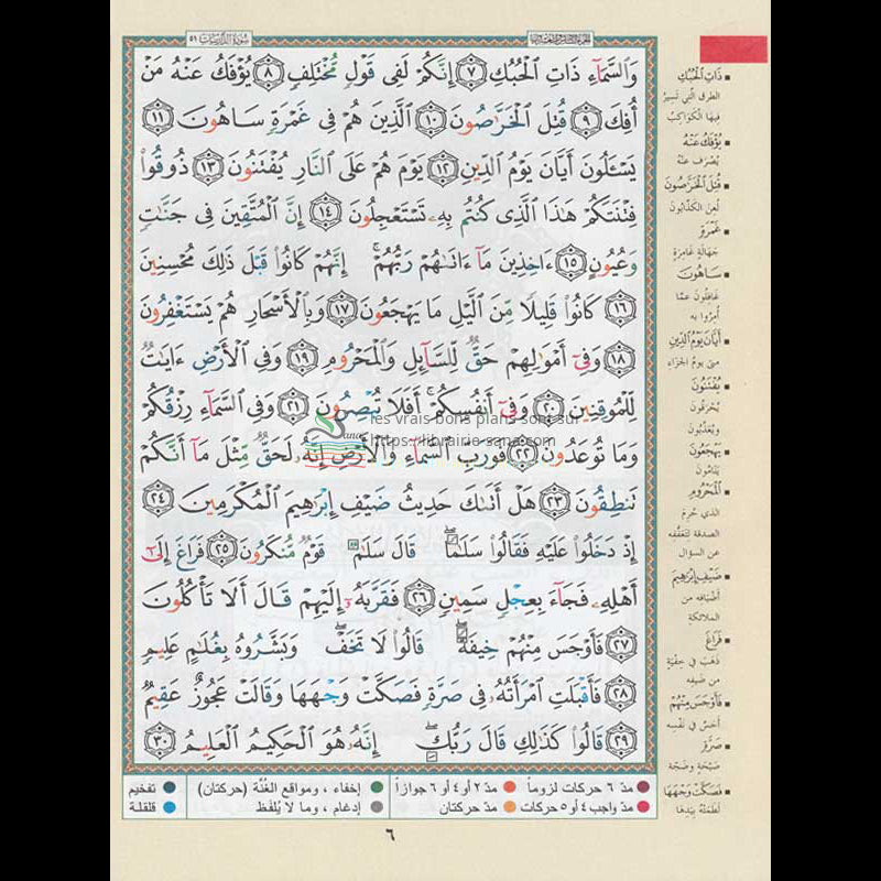 Voici le Coran en langue arabe, avec les règles de tajwid indiquées par un code couleur très simple à utiliser. Il est spécialement conçu pour la récitation dans le respect des règles du Tajwid (Hafs) Il débute par la sourate dhariyat et se termine par la sourate hadid.