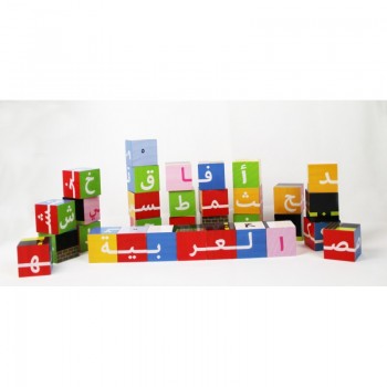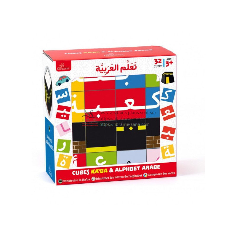 Le jouet "Cubes Kaa'ba et Alphabet arabe" est un jeu éducatif de 32 cubes en bois : 27 cubes servent à la construction du modèle de la Ka'ba.