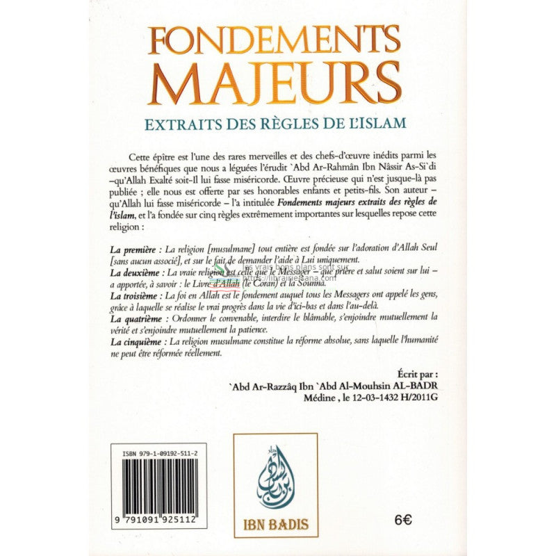 Cette épître est l'une des rares merveilles et des chefs d'oeuvres inédits parmi les oeuvres bénéfiques que nous a léguées l'érudit 'Abd Ar Rahman Ibn Nassir As Sa'di qu'Allah exalté soit-Il lui fasse miséricorde. Oeuvre précieuse qui n'est jusque-là pas publiée; elle nous est offerte par ses honorables enfants et petits-fils. Son auteur qu'Allah lui fasse miséricorde l'a intitulée "Fondements majeurs extraits des règles de l'Islam", et l'a fondée sur cinq règles extrêmement importantes sur lesquelles repose cette religion :