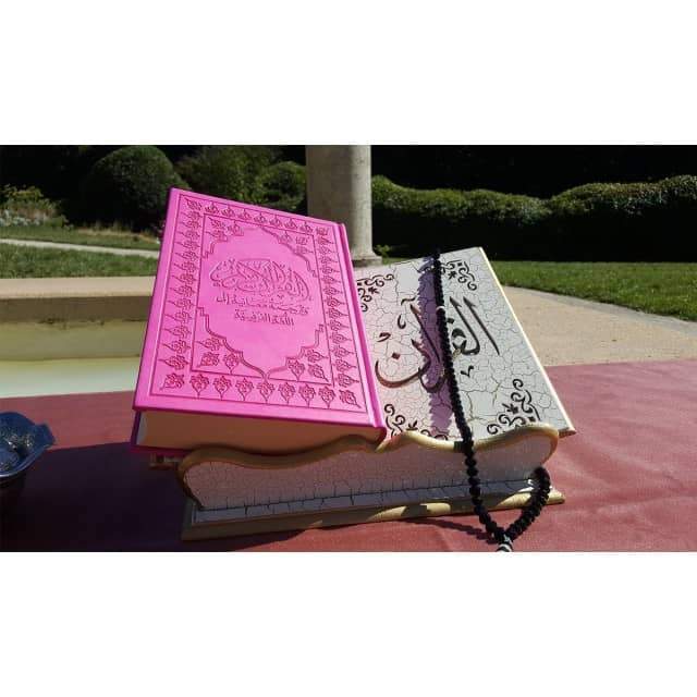 Format avec couverture rigide couleur Rose. En face de chaque page en version Arabe la page en français avec sens et traduction