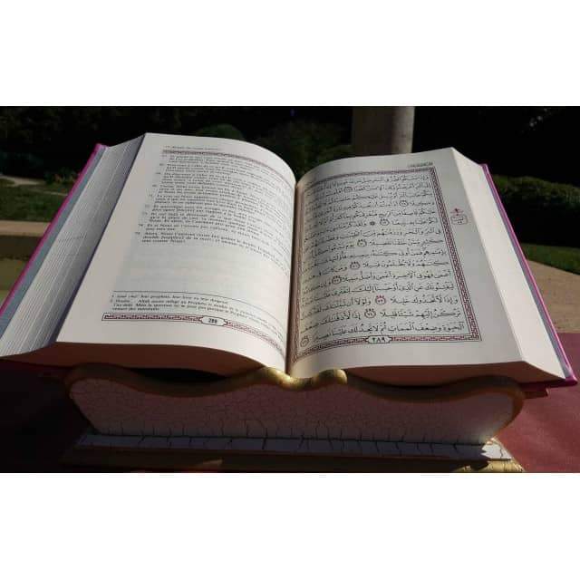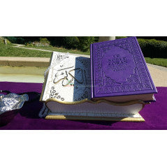 Format avec couverture rigide couleur Violet. En face de chaque page en version Arabe la page en français avec sens et traduction.