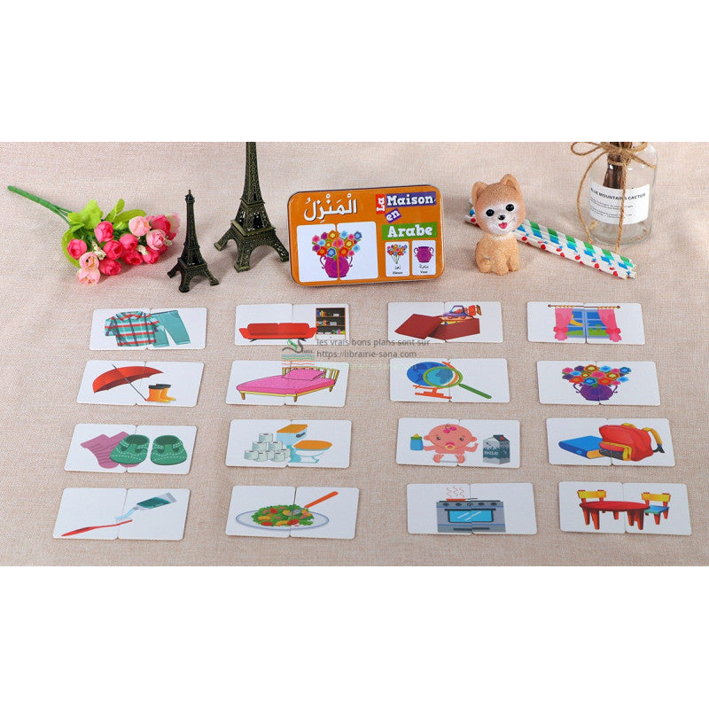 offrez ce puzzle d'association “La maison” à votre enfant, est un moyen incroyable pour l'aider tout en jouant et s'amusant à développer son langage, son organisation et sa concentration. Votre enfant apprendra à regrouper les cartes, paire par paire et apprendre en Arabe et en Français, le vocabulaire de la maison.