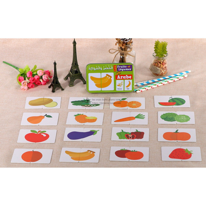 votre enfant apprendra à regrouper les cartes, paire par paire et apprendre aussi les noms en Arabe et en Français, des Fruits et Légumes.