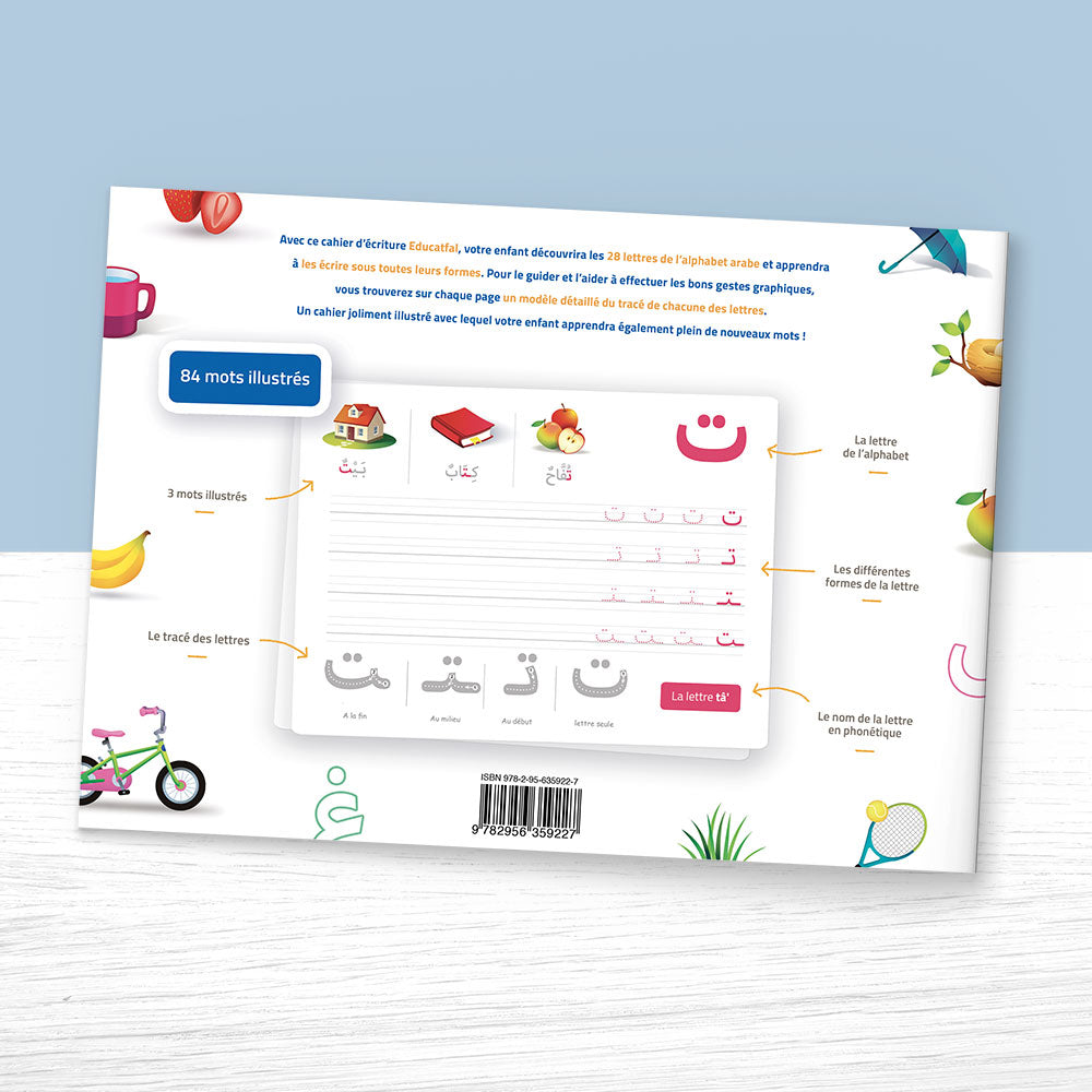 Avec ce cahier d’écriture Educatfal, votre enfant découvrira les 28 lettres de l’alphabet arabe et apprendra à les écrire sous toutes leurs formes. Pour le guider et l’aider à effectuer les bons gestes graphiques, vous trouverez sur chaque page un modèle détaillé du tracé de chacune des lettres.